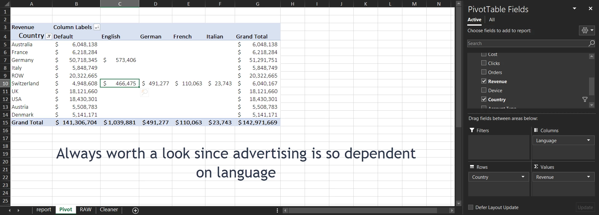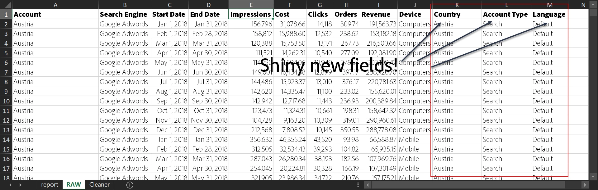 Cleaned up data + Assumptions – I’ve assumed any account that’s not Shopping is Search, any language that’s not mentioned is the Default, and all the currencies are in USD