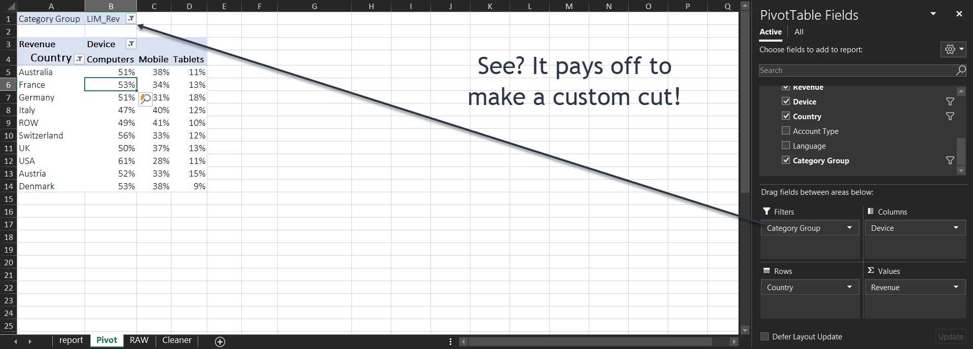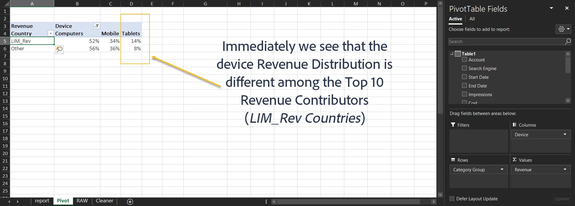 One thing I like to do is to keep my grouped countries together. Let’s create a new field called “Category Group” that will have the value “LIM_Rev” for the top 10 (remember, you can take 5, 20, etc.) revenue contributing countries and add it to the RAW data as a dimension (more on those later). This grouping then allows me to do quick comparisons and check if the LIM countries are different from the others (besides saving me the time of filtering it individually every time I want the top ten by Revenue, or top ten by Cost etc.)