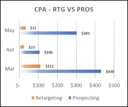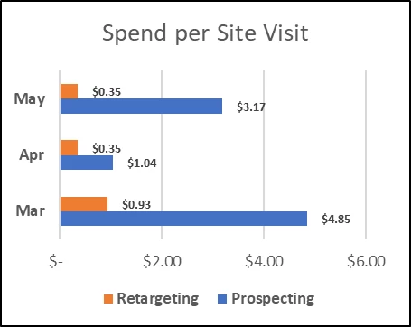 Here is a CPA and site visit comparison between prospecting and retargeting for a Mobile Network brand with an extensive presence in the US for the time period of March to May 2020.