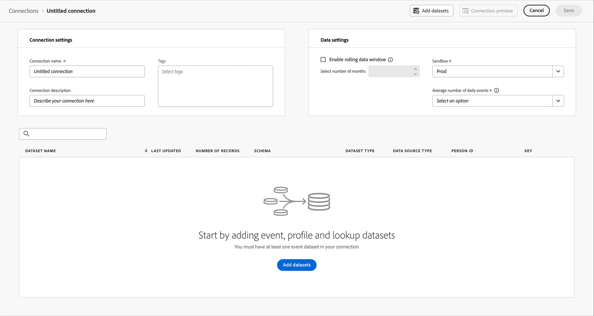 Figure 1: Customer Journey Analytics: Create new Connection settings and Data settings screen