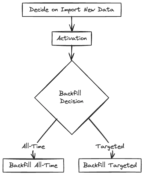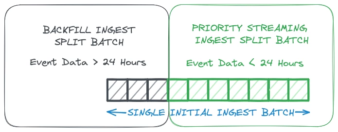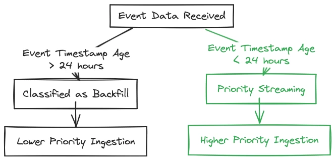 - Event data older than 24 hours, even if it's part of the same batch as newer data, is classified as backfill and split into a separate batch. This backfill classification status applies to all events within the designated batch with timestamps that exceed the 24-hour mark. This data is ingested at a lower priority to manage system resources efficiently.
