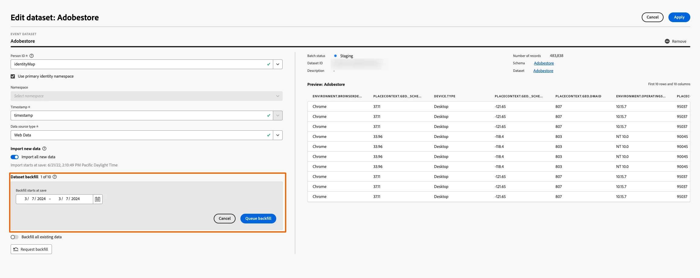 Dataset backfill: This feature allows you to backfill all existing historical data from the Experience Platform for a specific dataset in the given Connection. It's useful if you need to include data from a time before the dataset's most recent ingestion into CJA. This feature helps fill data history gaps, providing a more comprehensive view of your data trends.