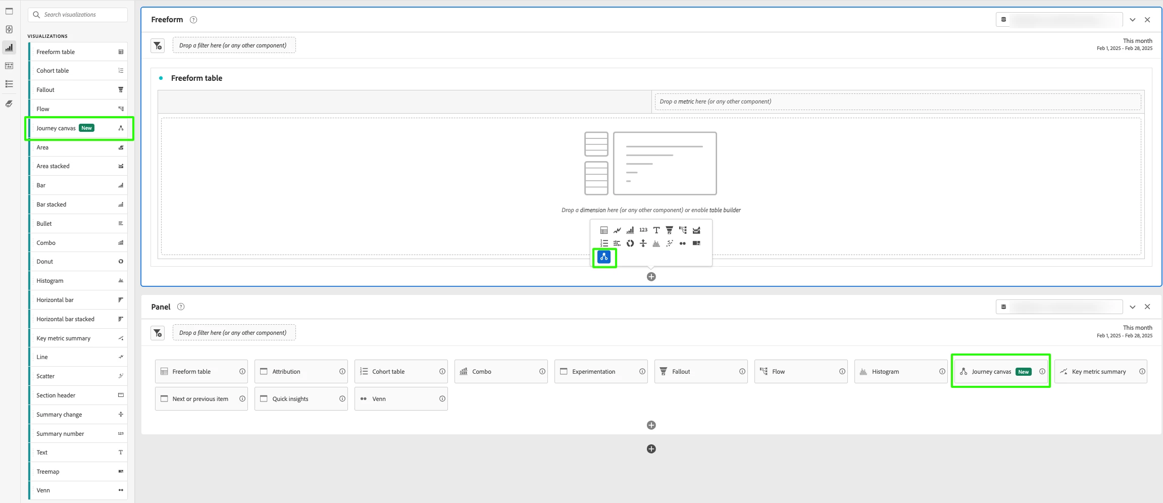 - Add Journey Canvas by selecting it from the Visualizations tab in the left rail, clicking the "+" button at the bottom of a panel, or choosing it from within a Blank Panel.