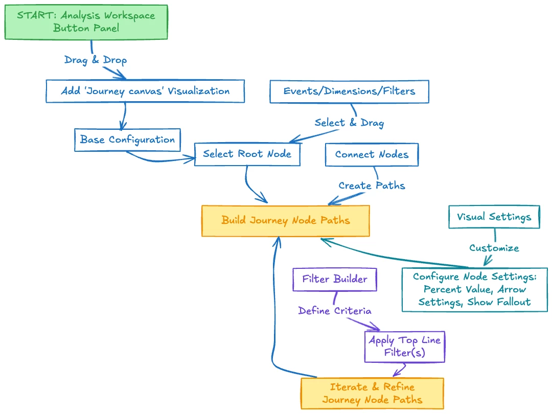 The Journey Canvas configuration process is designed to be both flexible and iterative in nature, providing analysts with the freedom to continuously modify and expand their journey visualizations. This adaptability enables teams to progressively refine their analysis and uncover increasingly deeper insights into customer behavior patterns across various touchpoints and interactions.