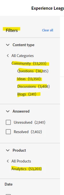 Add the ability to filter community search results by type: all, questions, ideas, discussions, etc. Add a label to the search result item that indicates whether the item is a question, idea, discussion, etc.