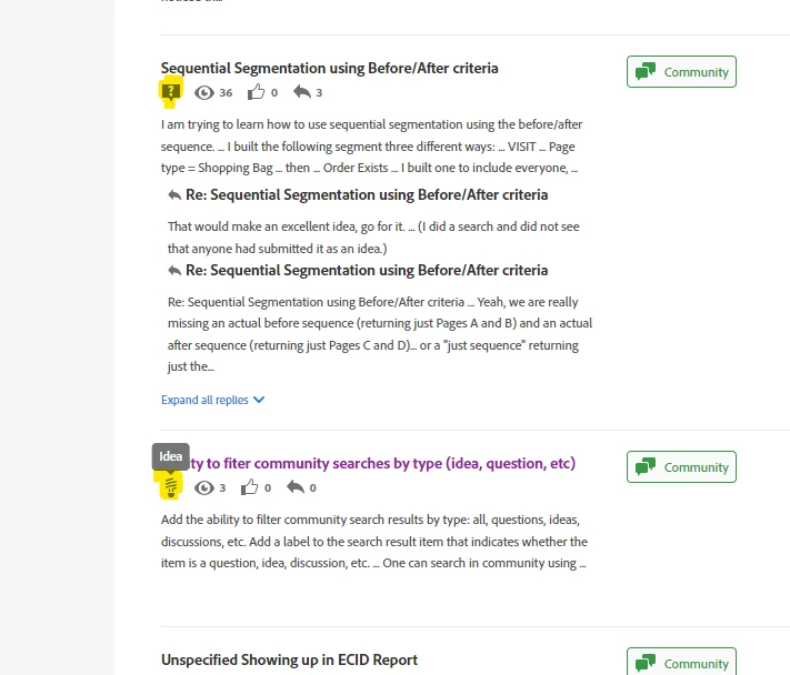One can search in community using the top of page search box with the community filer applied. When you get the results, there is no indication of whether the search result item is an idea, a question, or one of the other community types. You cannot filter to see just ideas, or questions, etc.