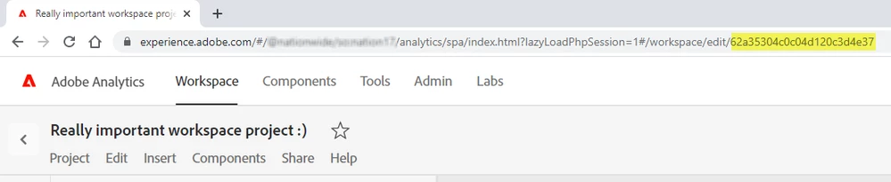The URL of workspace projects follow a standard format. While you are in a workspace project you can see a long alpha-numeric string at the end of the URL (Highlighted in yellow below).