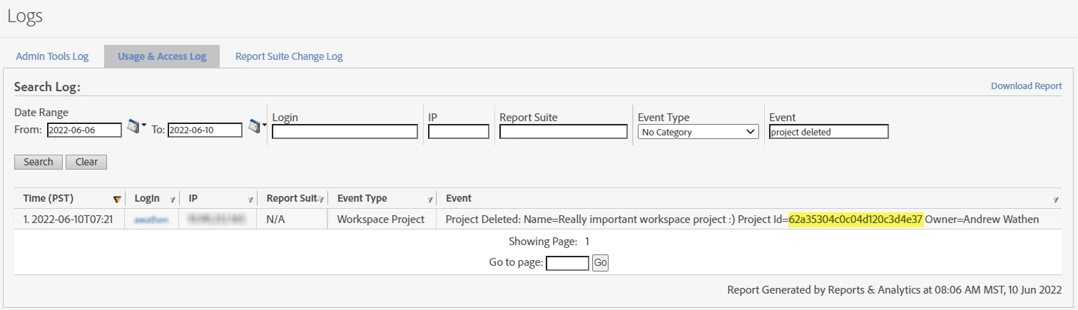 Fortunately, every time you do something with a workspace project (including when you delete a project!) an audit log is created in the "Usage & Access Log". Critically, this audit log also includes the project ID (highlighted in yellow below).