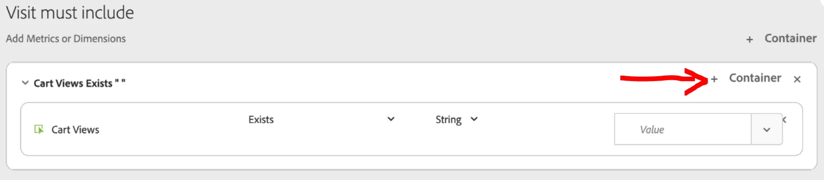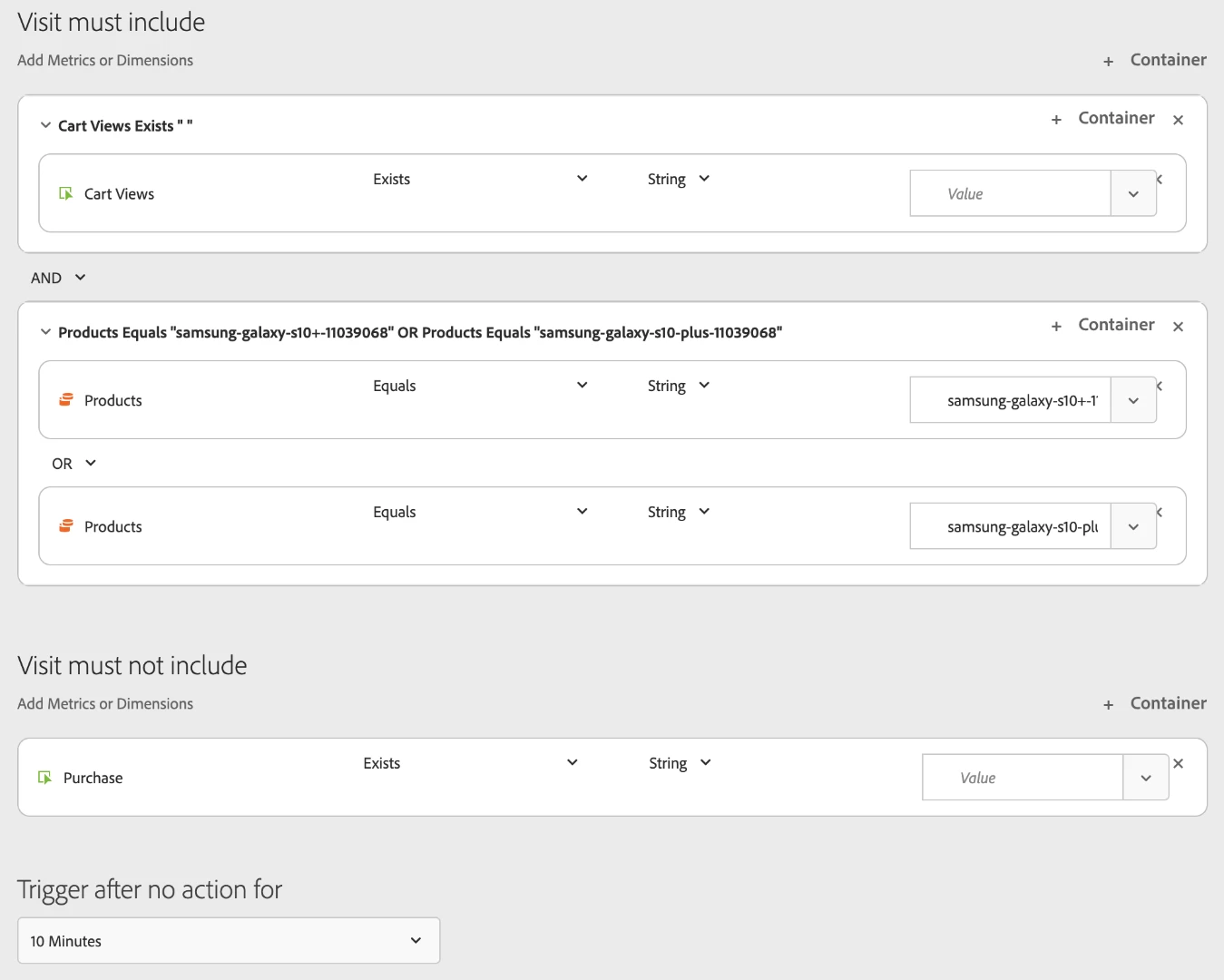 I've been playing around with the filter conditions and would like to set up a basic cart abandonment case where I want to make sure the user has viewed the cart with 1..n products (names taken from the analytics tracking request) but not purchased the product(s).
