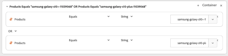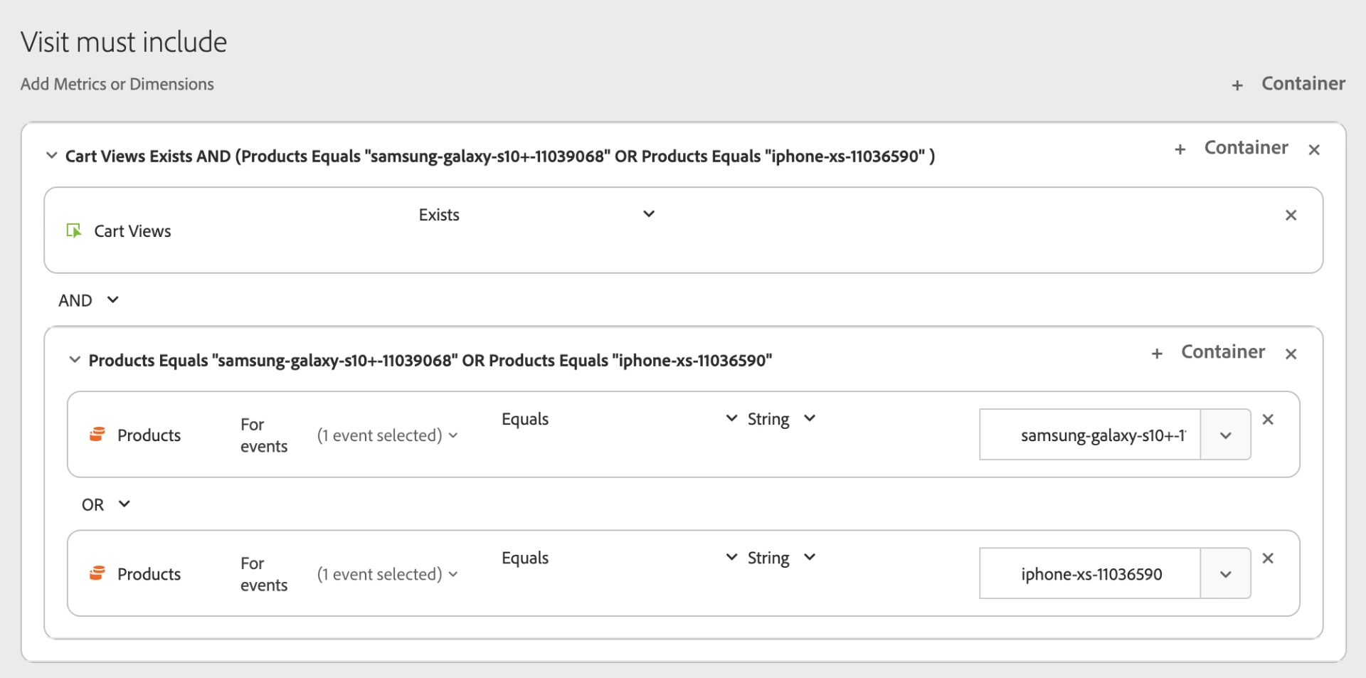 So what part of the "Cart View AND (Product 1 OR Product 2)" is wrong?