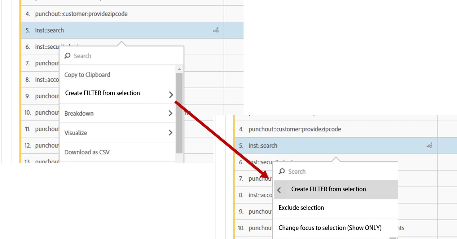 Selecting the "Create filter from selection menu" item from the menu could open to a sub-menu with several more options, but below are two as an example (exclude and focus):