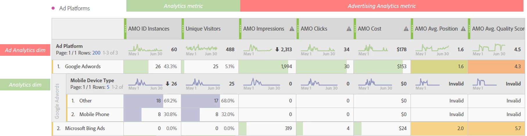 You cannot breakdown the Ad Analytics integrated metrics however (impressions, clicks, cost, avg. position, avg. quality score) because that data happens offsite and is not associated with a specific visitor ID. I don't believe Google let's you breakdown that information either, for the same reasons. You can only look at that information by the AMO ID, its metadata, or trended.
