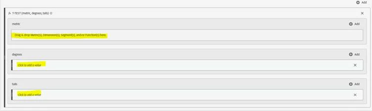 Example below with the T-Test function, where the user has to enter the metric, the degrees and the tails.