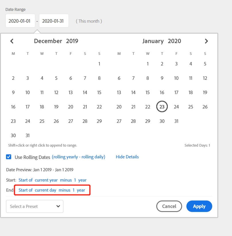 When selecting the start of current "day" minus 1 year, the output is the start day of last year, can you get it fixed?