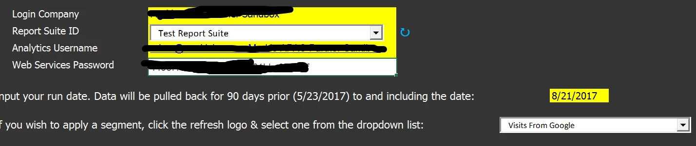 • All report suites for a given login company are now retrievable on the Instructions sheet (use the refresh icon to the right of the report suite combo box to refresh the list).