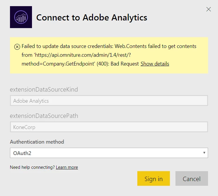 Hi, I am trying to add data sources from adobe analytics to power bi, but I can't sign in to my adobe account. I get this error: