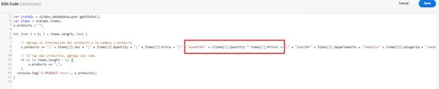 I need to create a custom event through the custom code in the Data Collection rule. To do this, I first enabled event 38 in Adobe Analytics (image 1). Then, within Data Collection, I added the code snippet to the Purchase rule, assigning it to event 38 (image 2). Interestingly, when testing, the s.products variable shows the calculation for this event (image 3), but the data is not being sent to Adobe Analytics. We need your help to review this issue.