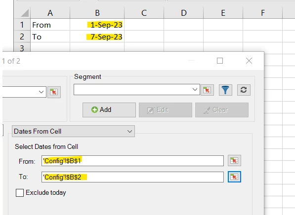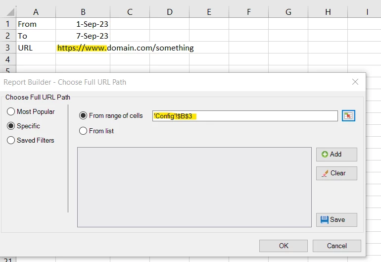 Choose the "URL" eVar under Custom Conversion report... now for your date ranges, choose "Dates from Cells" as the drop down option, and choose the From and To cells in your config sheet in your Request: