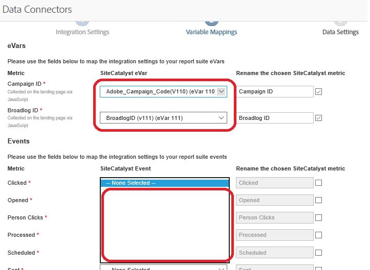 I have created the CID and BID conversion classifications (Adobe_campaign_code and BroadlogID eVars) in the report suite and I am able to map it with the corresponding fields as well (show in the first red coloured box).