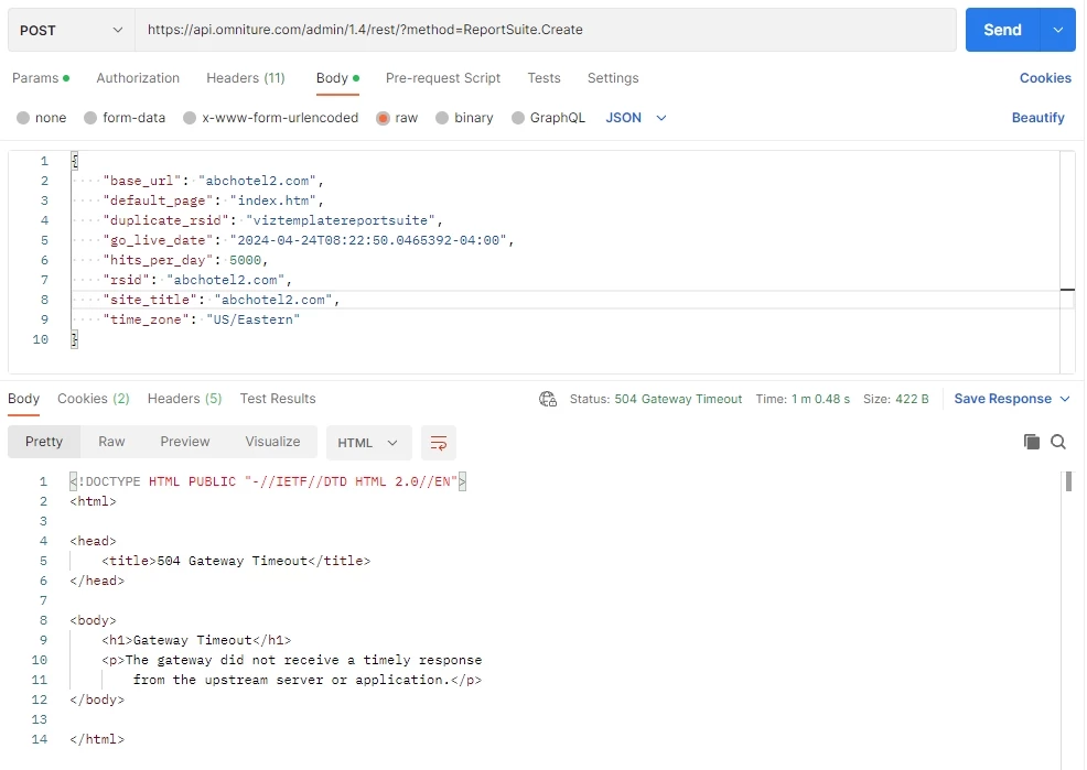 The Adobe API is responding with a 504 Gateway Timeout any time a request goes over 60 seconds long. We are repeatedly getting this when trying to create report suites by duplicating an existing template report suite (a process that takes Adobe a while to complete). See the attached screenshot for a Postman example of this occurring. We just migrated from Service Account (JWT) credential to OAuth Server-to-Server credential when this started happening, not sure if that is related.