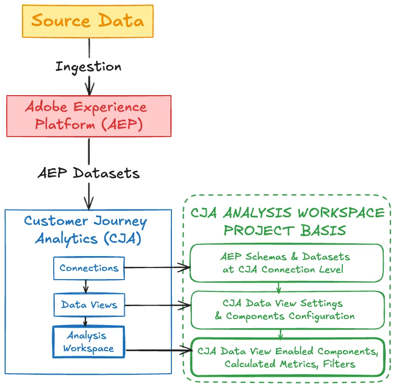 Analysis Workspace Projects in CJA are built on a framework of interconnected Adobe Experience Cloud (AEC) elements. These range from AEP schemas and datasets to CJA Connections and Data Views, culminating in the components that form the analytical building blocks of Analysis Workspace. Together, these elements create a comprehensive analytical ecosystem. By leveraging this integrated framework, analysts using CJA Analysis Workspace can uncover powerful insights and gain a holistic understanding of the customer journey across various touchpoints, platforms, and channels.