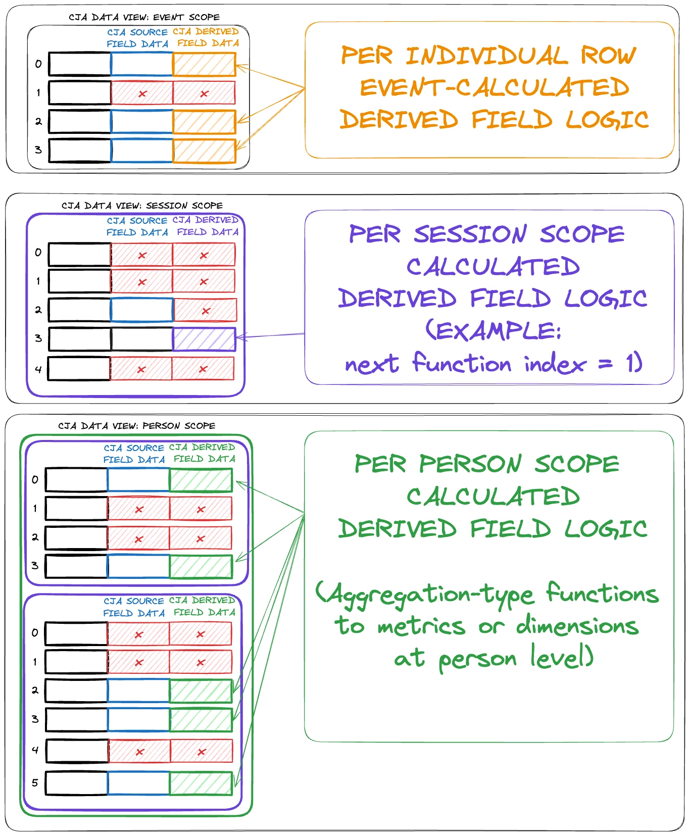 The diagram below compares and contrasts the scopes of derived fields at the Event, Session, and Person levels. It shows how each derived field operates within its specific scope, highlighting their logical characteristics.