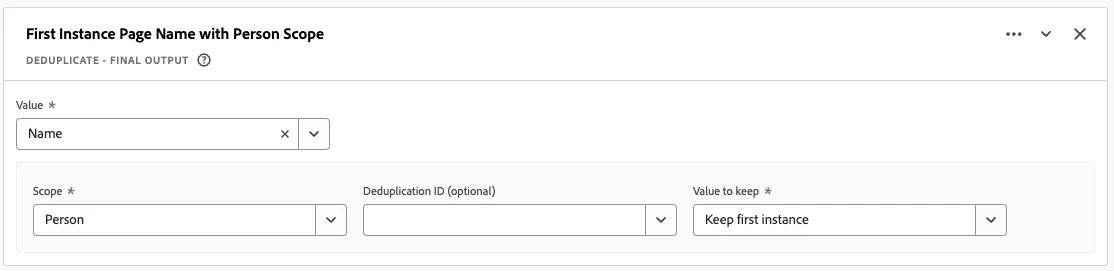 • Value: ◦ Rules ◦ Standard fields ◦ Fields ◦ String • Scope: ◦ Person ◦ Session • Deduplication ID: ◦ Rules ◦ Standard fields ◦ Fields ◦ String • Value to keep: ◦ Keep first instance ◦ Keep last instance |