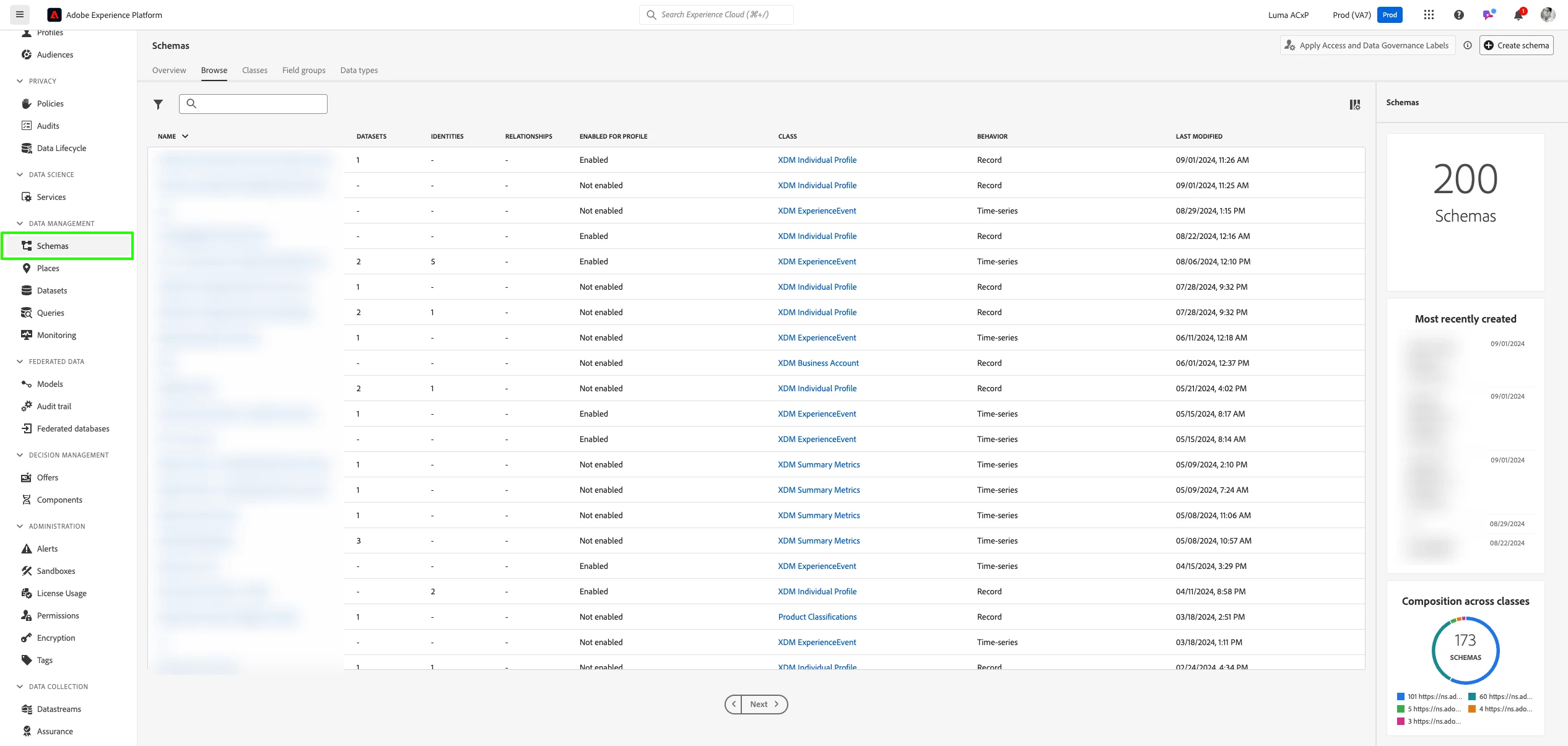 To access Schemas: In AEP, navigate to Data Management > Schemas > Browse