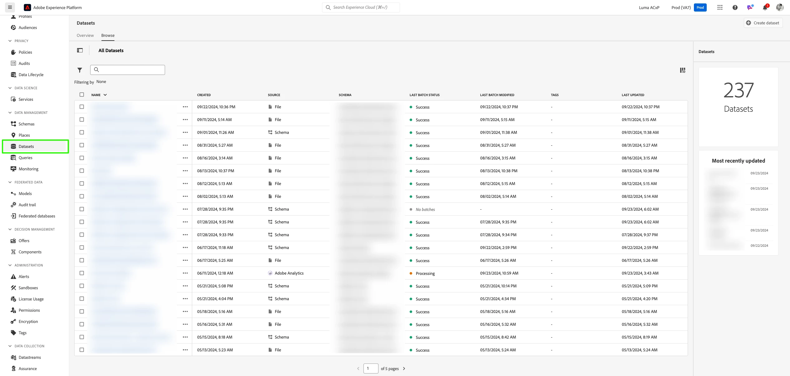 To access Datasets: In AEP, navigate to Data Management > Datasets > Browse