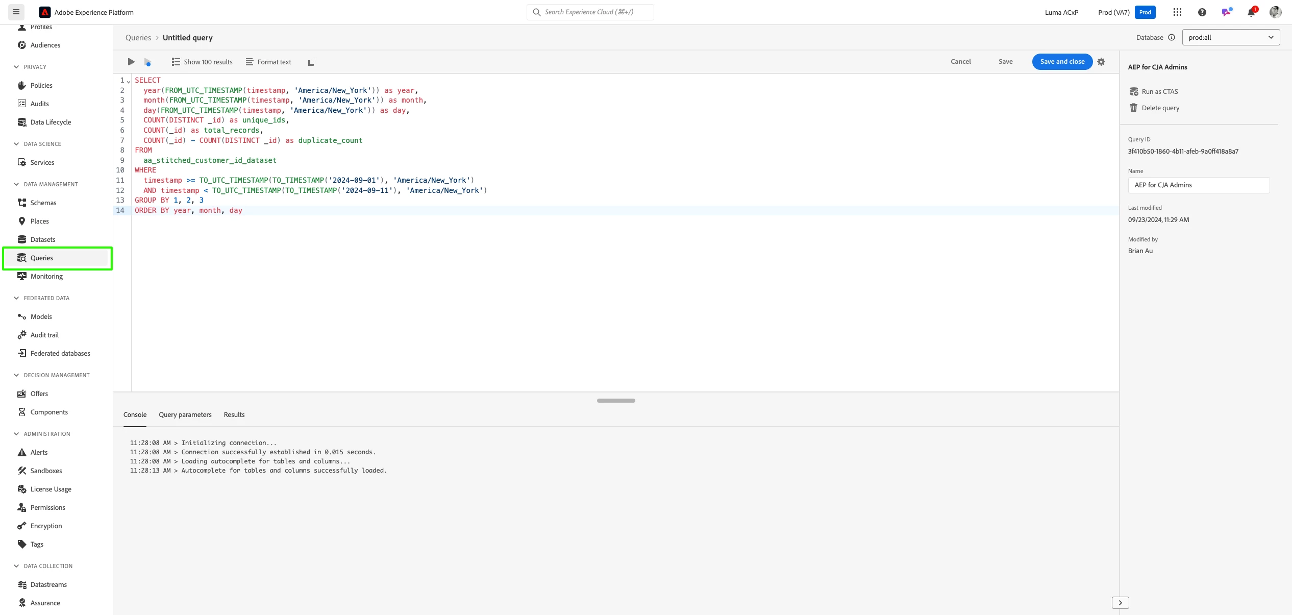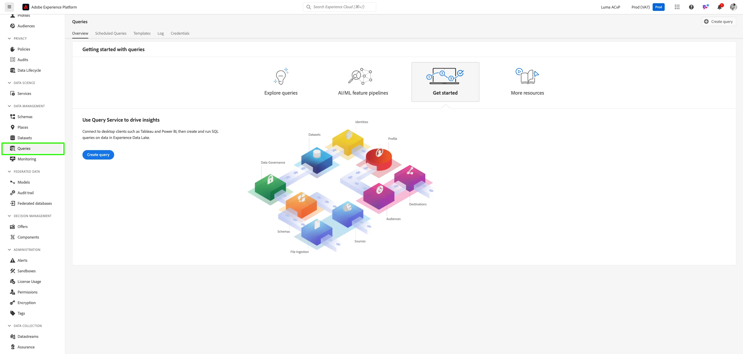To access Query Service Overview: In AEP, navigate to Data Management > Queries