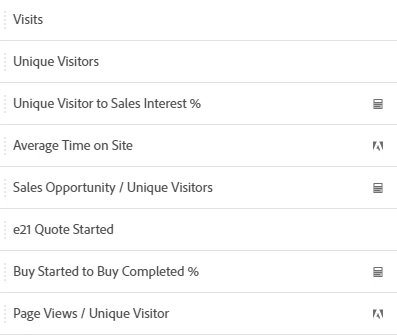 However, others have a little Adobe icon next to them. I'd assume this means they are Standard Metrics (as opposed to Custom). However, some pretty common metrics like Unique Visitors, Visits and Pageviews don't have the Adobe icon.