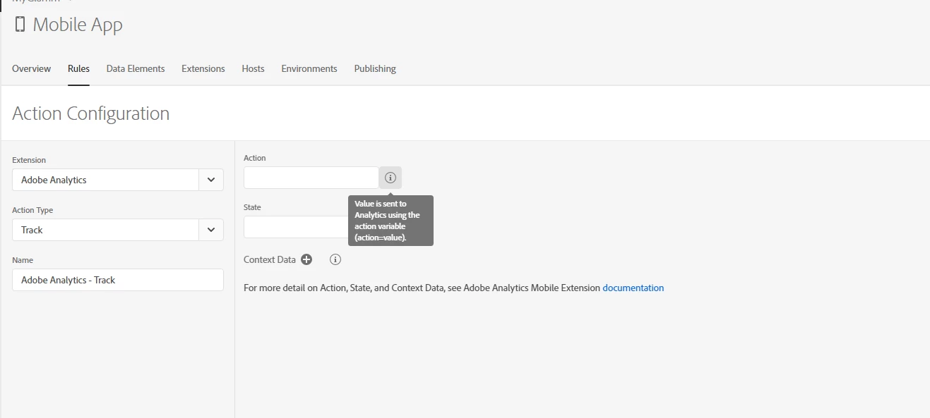 we are configuring context variables in adobe launch for Mobile implementation. Under Action section, there are options of "Action" and "State". Whats the usage of this and what has to be filled under this section. Attaching screenshot for reference.