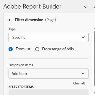 So Filters are limited to "Most Popular" (i.e. the top X items by metric), or a specific list of items (that you can curate here in the settings, or pull from a range of cells)