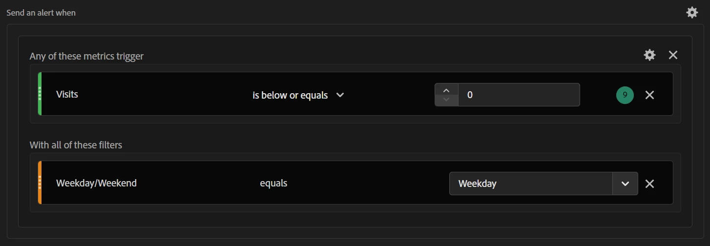 Background - I am setting up an alert to see if the tracking is broken for certain products. I have set up the following alert conditions: