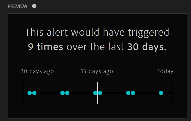 The alert preview is showing that it would have triggered 9 times in the last 30 days