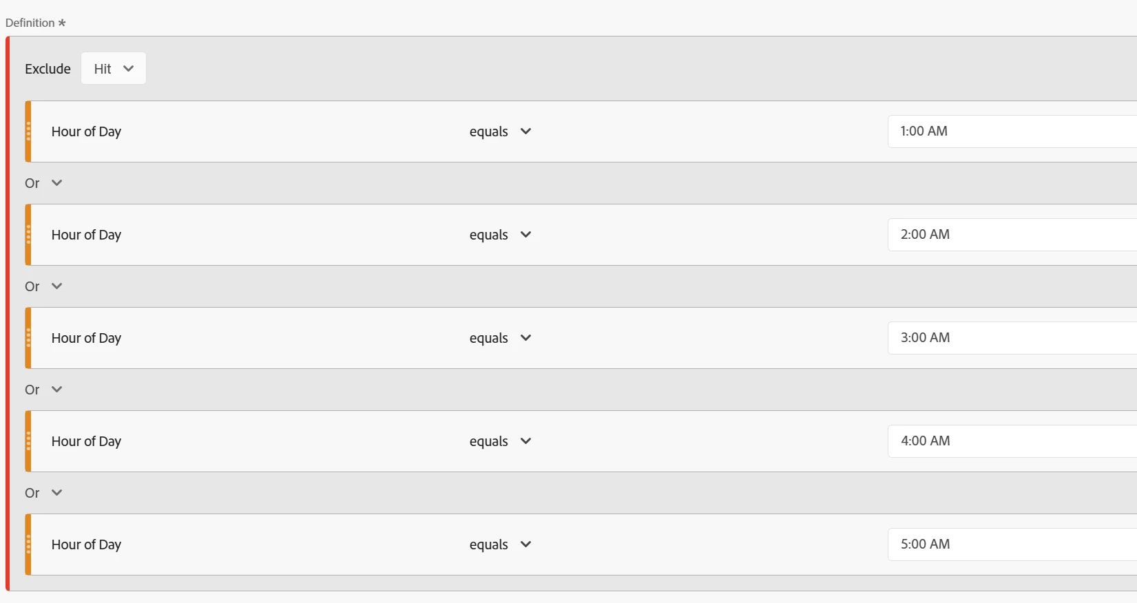 The other suggestion I have is to set up segments to exclude time periods you don't want to get alerts for. If you set up an hourly alert, it's going to check every hour for an anomaly. But if your traffic drops overnight (when everyone is asleep), it's more likely you'll get false positives. What I've done is make segments that exclude the hours between 11pm and 5am, that way we don't get false positives.