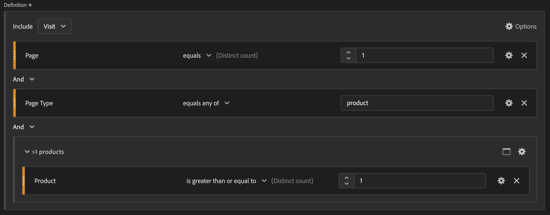 There's a really helpful demo I found that gets me close to this from @3792.lasser : https://www.youtube.com/watch?v=7A00dkA2cPI where she talks about Segmentation of Distinct Dimension Counts. What I'm struggling with is the next layer - I want to specify that the distinct pages in the visit are a specific page type, in this case product pages.
