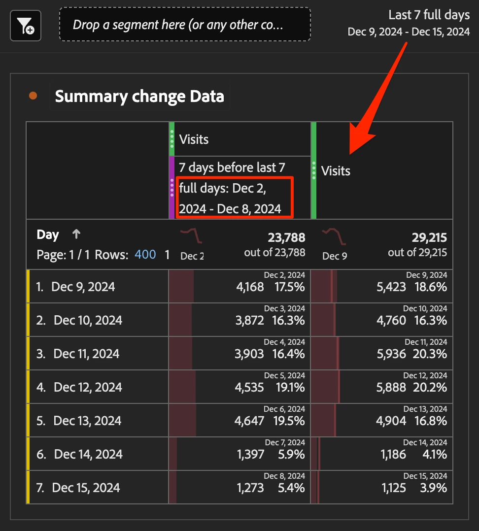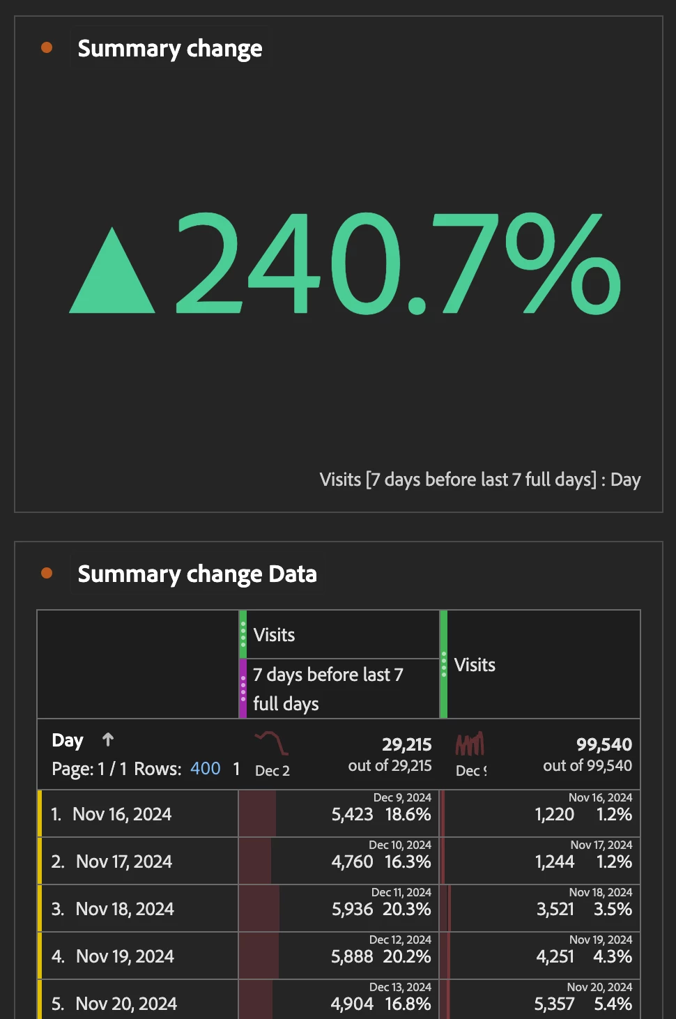 - Freeform table using the last 7 full days (Panel date range) vs the previous 7 days (custom date range in the workspace project).