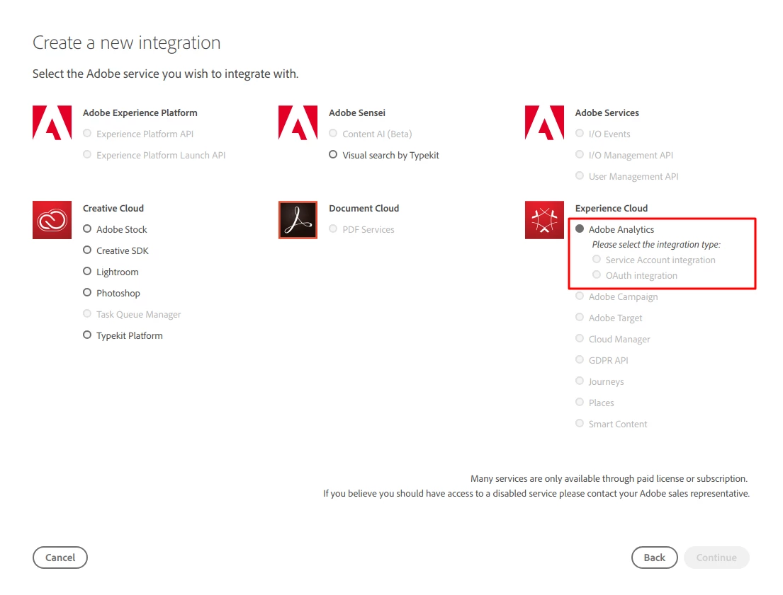 I tried to create new Integration with Analytic API via Adobe Console, but both integration type disabled. I can't find any mentions that Analytics API is paid feature.