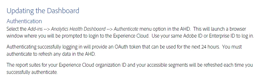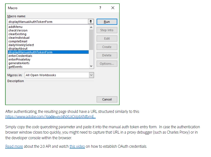 So I go to the next step that says to click authenticate. I do that, it opens a browser, I put in my Adobe login information, but then I get a 404 page. This also means that the excel file is perpetually loading and I eventually have to hit end task to close it. I've been stuck on this issue for a couple weeks. Does anyone know what is happening/how to fix it?