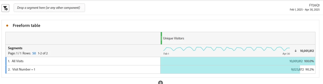 Apologies for a repeated topic. We get roughly 10M UV per quarter. My new visitor logic is (Visitor Container | Visit Number = 1). With this logic, 90% of my UV are "New Visitors." Do I need to adjust my logic for new visitors? This doesn't seem accurate at all.
