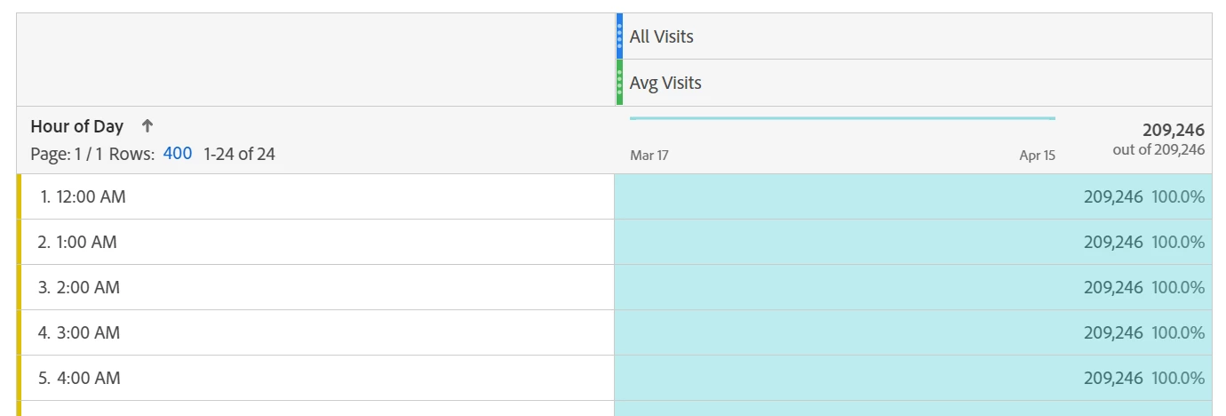 and then use that to breakdown by the Hour of Day dimension, I would expect it to give me the average per hour of day, however, it gives me only one value: the average of the entire selected time period. Like this: