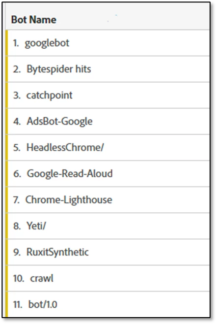 An external party – the IAB - provides to Adobe the list of user agents contained in the default IAB Bot List; and thus, Adobe cannot provide this list to you as a client. As a consolation, Adobe Workspace does provide a “Bot Name” dimension that provides a list of “friendly names” tied to the bot-based user agents. For example: