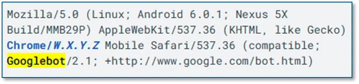 That being said, we can still deploy a solution that prevents at least some bot hits from being collected. For example, let's say we want to stop collecting all hits from Googlebot. That initially sounds like a daunting task because Googlebot is seemingly omnipresent and ubiquitous. Lucky for us, however, Google has willingly published a list of its Googlebot User-Agent headers, which makes the task of Googlebot identification that much easier to pull off. Interestingly enough, a common string contained in most of the Googlebot User-Agent headers is the term "Googlebot" – what a shock! For example: