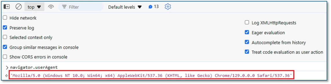 From a coding perspective, we can access the User-Agent header of every device via the DOM object known as navigator.userAgent. Here's my browser's User-Agent header, which I produced by typing "navigator.userAgent" into the Developer Tools console: