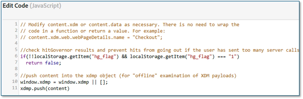 Tags allows you to deploy a callback function that runs after any AEP Web SDK sendEvent command is complete. For our purposes, the callback will run the hitGovernor function to determine whether the user/device has passed the threshold of sending too many server calls within a certain period of time.