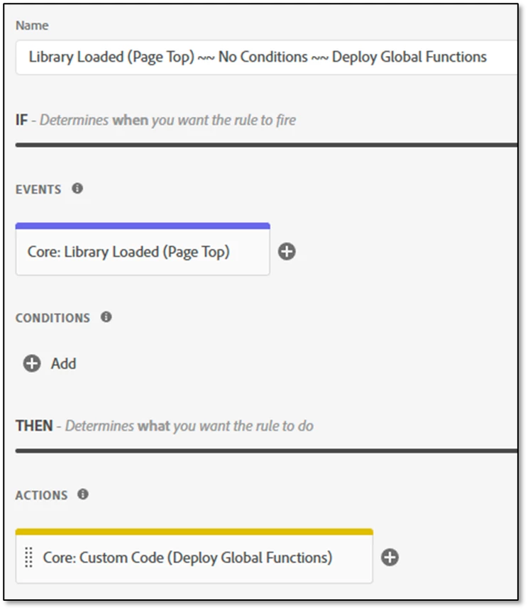In every Tags implementation that I am involved with, I add a rule that fires at the same time the Tags library begins to load. This rule will fire unconditionally and deploy helpful JavaScript functions or other code that the general data collection solution might need to use at any time. Here are the settings I recommend you use when you create your rule: