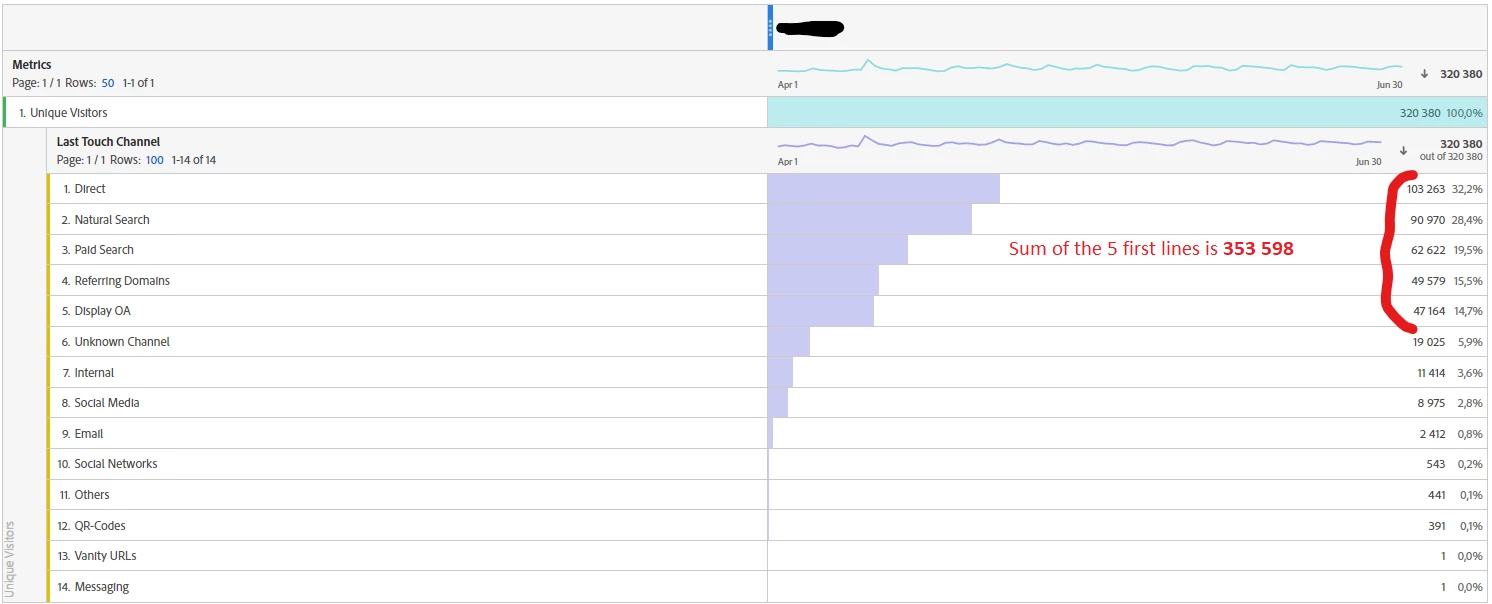 I want to analyze my unique visitors by last touch channel over a trimester. The total seems to be 320K. But once I sum up each line I see more than the total (the sum of the 5 first lines is already greater than the total).