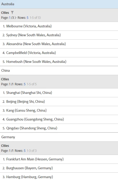 In the following screenshot, can I select all the cities in Australia, all the cities in China, all the cities in Germany, etc. and add 'time of the week' to all at once?