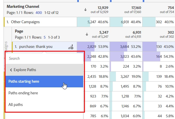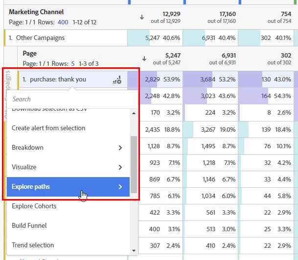 As a potential solution, I want to propose bringing a new right-click action to Freeform tables that allows users to explore paths quicker. In the mock-up below, a user could select "Explore paths" when right-clicking dimension items or metrics: